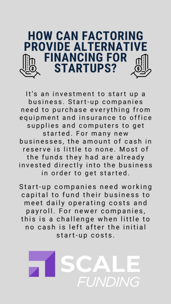 Accounts receivable financing, also known as invoice factoring, is a common and beneficial way many companies use to finance their startups. Business loans and business lines of credit can be difficult for new companies with little-to-no financial history to secure. Accounts receivable factoring gives your startup the ability to accept new contracts while having a steady cash flow to keep up with operating costs.