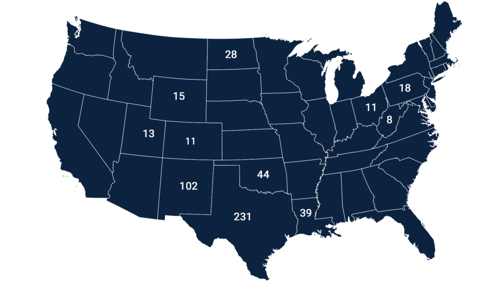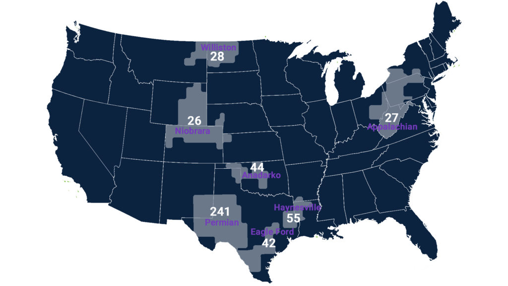 | Bakken Region Total: 31 Montana: 2 North Dakota: 28 | Rocky Mountain Total: 141 Colorado: 11 New Mexico: 102 Utah: 13 Wyoming: 15 | Central Plains Total: 44 Oklahoma: 44 Kansas: 0 Arkansas: 0 |