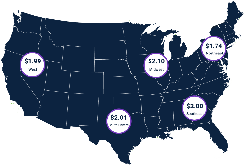 According to DAT, the highest average van rates are in the Midwest at $2.10 per mile. The lowest average van rates are in the East Coast at $1.74 per mile.
