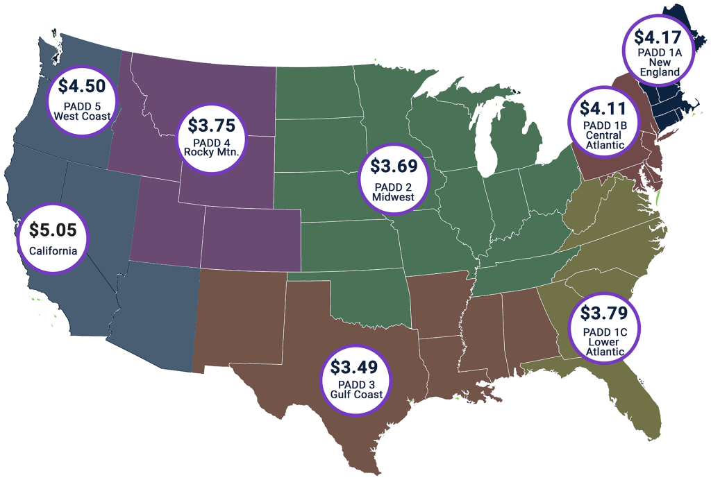 | West Coast (PADD 5) | 4.651 | 4.723 | 4.702 | -0.021 | +0.010 |