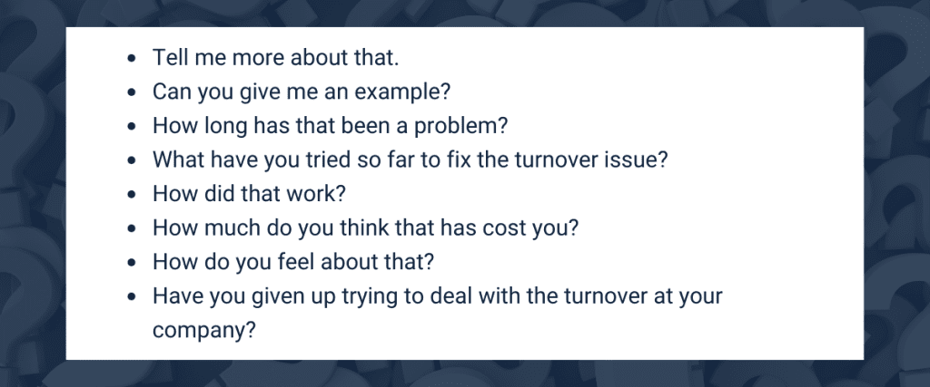 Jeff suggested we ask questions to get to the real pain, the real problem. For example, if a client tells you they are struggling with turnover, the Sandler Pain Funnel uses the sequential questioning technique to ask a series of questions: