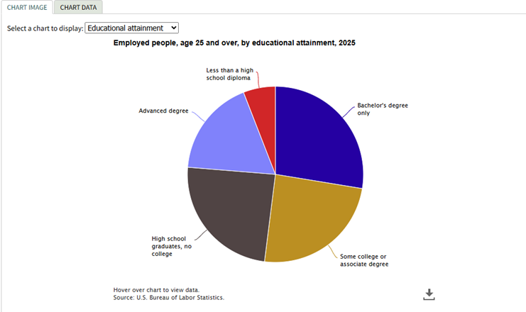 According to TED: The Economics Daily, dated March 13th, over half of the workforce (54.6%) has less education than a Bachelor’s degree.